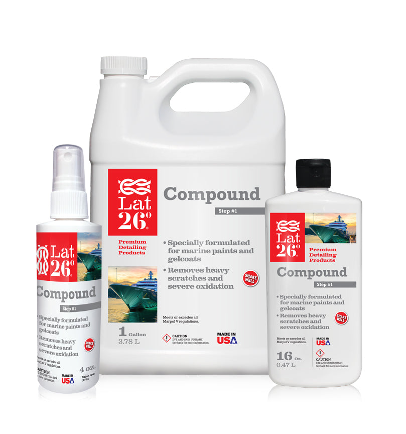 Lat 26 Degrees Compound #1 is a marine-grade heavy-duty compound used to remove severe oxidation and damaged surfaces from boat and yacht paint and gelcoat. According to the manufacturer, it can also be used to remove 1500-grit sanding scratches. The compound is part of a multi-step polishing system designed to restore surfaces to like-new condition.